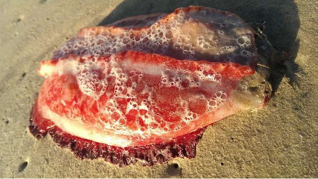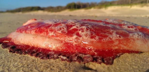 (神秘的地球报道)澳洲女子希格斯(Debbie Higgs)周一早上在阳光海岸散步时,发现一只长约25厘米的奇怪生物冲了上岸。希格斯形容该生物色泽鲜红,没有四肢、眼睛和嘴巴,躯体带有褶边,且冰冷腥臭,软软的像是水母。