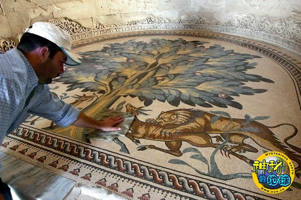 2005年,在美国第一夫人劳拉-布什参观希沙姆王宫前,一名巴勒斯坦工人清理“生命之树” 镶嵌地板。希沙姆王宫是位于约旦河西岸城市杰里科以北的古代遗址,建于公元8世纪,为阿拉伯帝国第一个世袭王朝倭马亚王朝的王宫,公元747年在地震中遭受破坏并被沙子掩埋时,这座王宫尚在建设中。在1934年被考古学家发现以前,希沙姆王宫遗址在一千多年里都处于被人遗忘的角落。今天,专家已对这处历史遗址有了基本的了解,不过他们担心,随着杰里科不断加强城市和农业开发,幸存至今的希沙姆王宫可能也会消失。