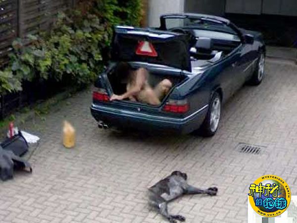 这次谷歌街景在德国曼海姆街头拍到一个裸男从汽车后备箱钻出,他的旁边还有一只不知生死的狗的诡异画面,而他们的旁边还有一把大的黑色遮阳伞。有人猜测,这名裸男当时是在清理汽车后备箱,因为这之前装了这条死狗,也有人怀疑这名裸男当时是被绑架了,绑匪看到谷歌街景拍摄车来拍摄才暂时离开,留下该名裸男自己从后备箱里钻出来。