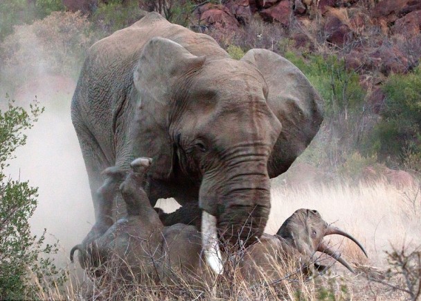 英国《每日邮报》引述科克称,事发时一只只有一边象牙的雄象,突然冲向犀牛妈妈和其儿子。犀牛妈妈赶忙保护小犀牛,结果被雄象反转至四脚朝天。雄象随后不断踢打及踩向犀牛妈妈,犀牛妈妈却毫无反击之力,终被雄象蹂躏至死。