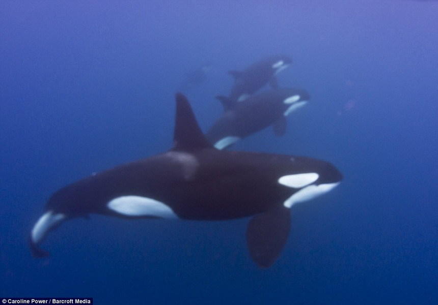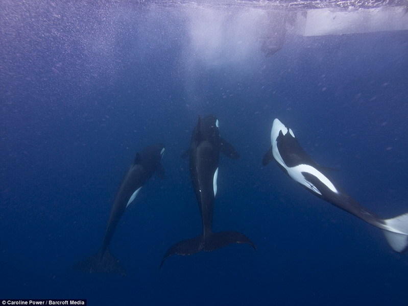 摄影师卡洛琳-鲍威尔(Caroline Power)记录了一条雄性和两条雌性逆戟鲸如何快速游动在虎鲨周围,迫使它到达浅海区域,最终将它杀死,吞噬其尸体。