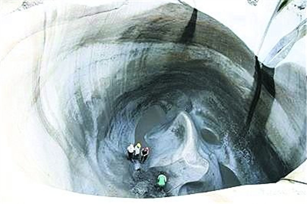 韩同林认定,这个花岗岩石上的大石坑,学名叫“岩臼”。“应该是形成于距今二三百万年前的冰川时期。冰川融化过程中,水自上而下垂直落下来,冲击而成。”韩同林说,“当时,延庆地区曾经覆盖着厚达千米以上的冰川。冰川融化过程中,水垂直落下来冲击巨石形成巨坑。之所以叫做冰臼,是因为其具有口小、肚大的特点,酷似我国古代用于舂米的石臼。”韩同林表示,在北京地区长陵镇望宝川村、怀柔琉璃庙地区都曾发现过由数十厘米至两三米深的冰臼,但延庆这么深的冰臼还是首次发现。值得一提的是,在这个巨型冰臼的底端,还耸立着一座6米多高十分奇特的“小山”。“经过冰川融水携带巨大滚圆砾石的冲刷、研磨,小山的表面打磨得十分精密,摸起来光滑极了!”