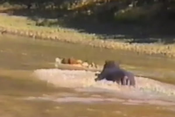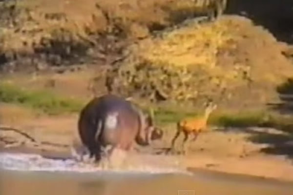 就在连续几次拉扯的破水声后,河马突然站起,以排山倒海之势往鳄鱼冲去,接着低头到处查看。影片在此(约50秒处)有剪接,接着镜头就出现两只河马左右围着羚羊,画面左方的河马凶狠的用头往前顶,似乎在「赶羚羊」,接着还一直从水中追逐到岸上,直到羚羊顺利脱险,画面才结束。