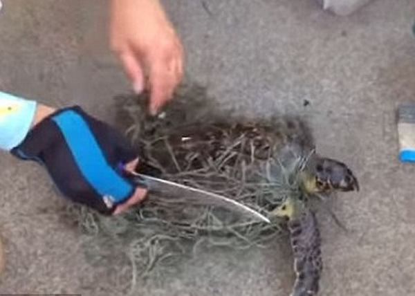 庄逊指,鬼网看起来至少有10米深。当时海龟在水面不停挣扎,庄逊于是割下渔网救起海龟,并在船上用刀子割开渔网,再把海龟放回大海。
