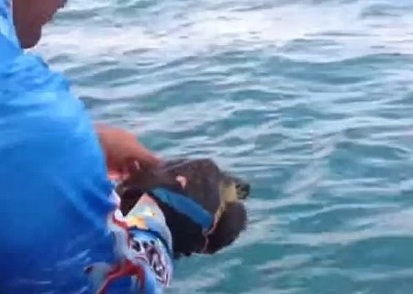 解海龟解网后,庄逊就放它回到大海。