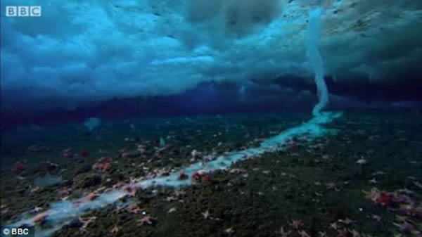 英国广播公司的摄制组首次拍到冰柱沉入南极洲海底的可怕景象。这个冰柱堪称死神,杀死沿途接触到的一切生物。这种可怕的冰柱由下沉的盐水形成,由于盐水温度极低,导致周围海水迅速冻结。下沉过程中,冰柱形成的“死亡之网”迅速扩张,杀死沿途的海胆和海星。