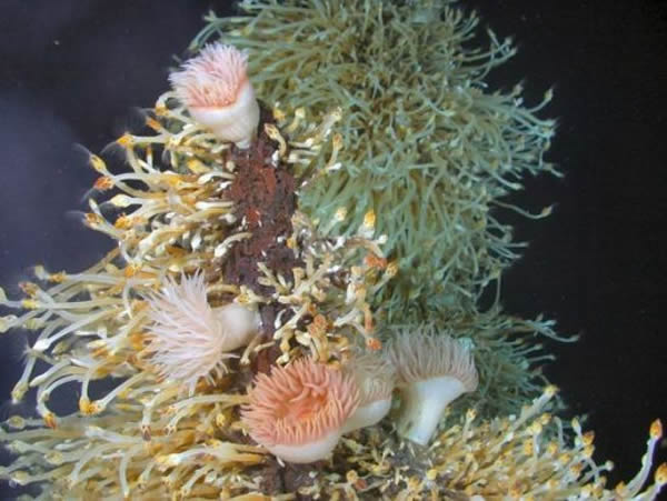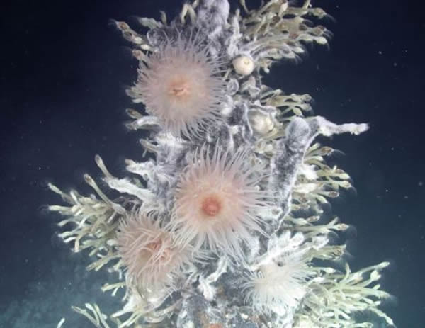 热液喷口处的海葵和藤壶:阳光无法照射到这么深的地方,它们的生活环境一片漆黑,不过这些动物能通过分解在烟里发现的有毒化学物质获得能量