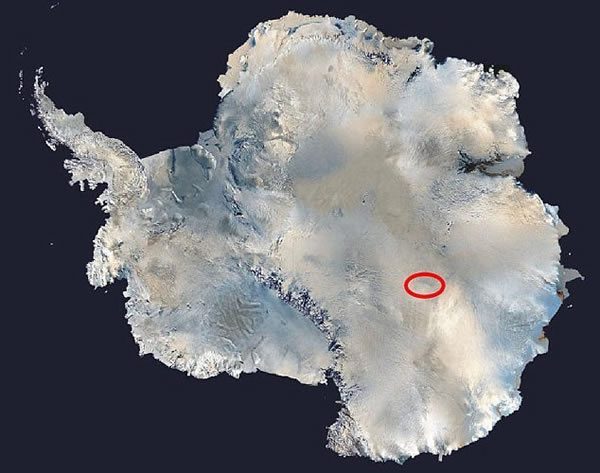 目前,俄罗斯一支科学家小组在南极洲钻探拥有2000万年历史神秘冰川湖泊时与美国同事失去了联系已有5天,图中红圈代表俄罗斯科学家工作的区域