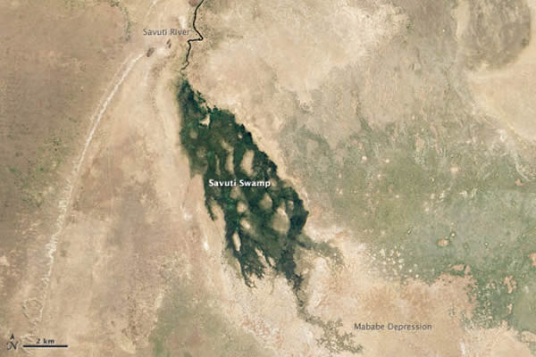 萨维缇河(Savuti River)是奥卡万戈三角洲的河道之一,位于奥卡万戈东北大约80公里处。 2012年5月26日,美国国家航空航天局的地球观测卫星1号(EO-1号)上的先进陆地成像仪(ALI)拍下了这幅自然色照片,展示了奥卡万戈三角洲的洪水通过萨维缇河流入萨维缇湿地的景象。萨维缇湿地位于博茨瓦纳的乔贝国家公园(Chobe National Park)内。