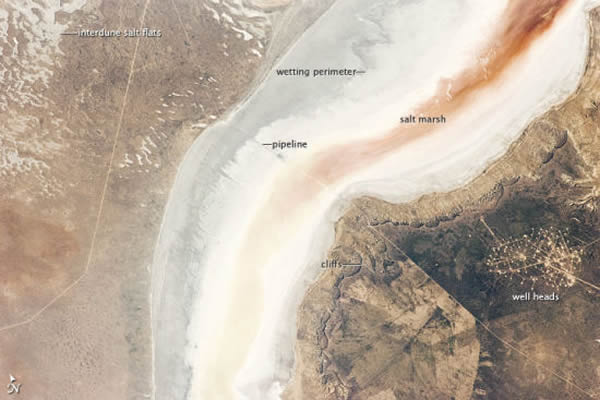 包含凯达克盐沼在内的洼地东部边缘耸立着一些小悬崖。悬崖上面有一个高原――比盐沼约高200米,海拔160米余米――水平向东延伸数百公里。高原上井口密布,如果棕褐色圆点连成的几何图案。相比之下,洼地的西缘(照片左边)仅仅只比盐沼高出10米。照片中央的直线是一条输油管道。
