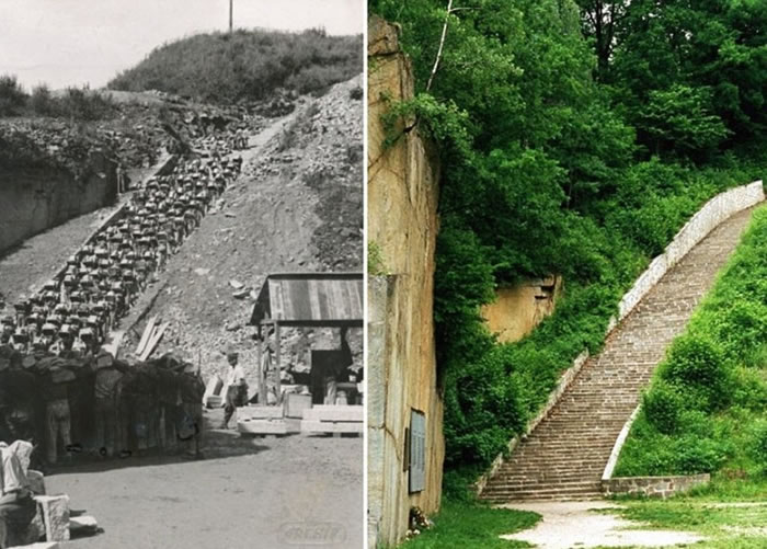 集中营的楼梯以碎石建成。右图为已修葺完毕的楼梯。