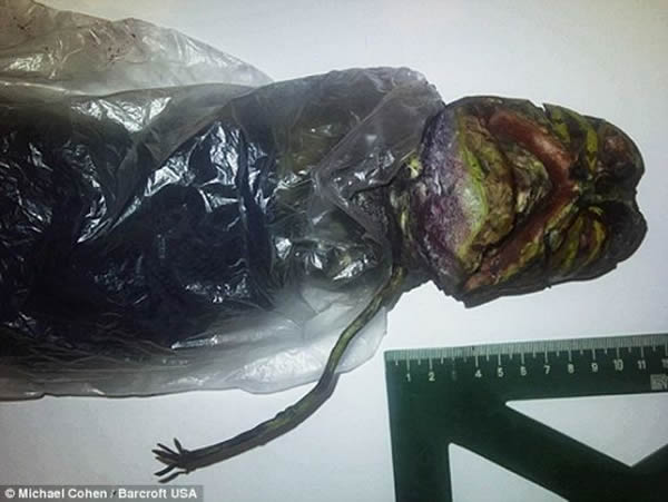这具外星人尸体据说是2009年在UFO坠毁现场发现的,它的脑袋巨大,眼睛呈球状,胳膊好似细绳