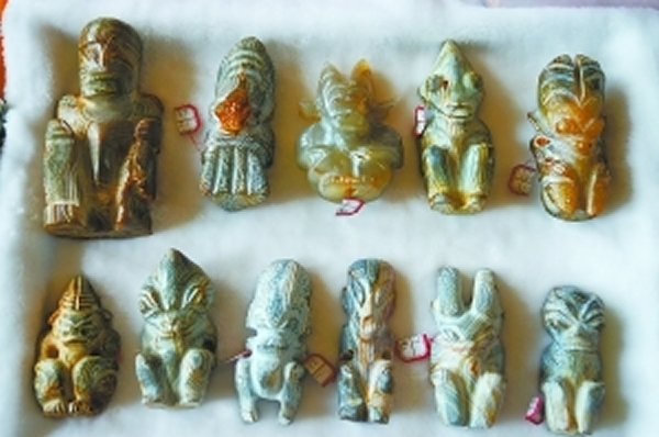 据馆藏此批雕像的北京市古玉标本研究中心主任王富天介绍,这些雕像是该中心历时近二十年从全国各地搜集来的。经检测,雕件的玉质主要含有二氧化硅,硬度7至7.5度。地质专家也确定不了这些实物材质的名称,其硬度只能用光学照射汽化工艺才能制作。部分雕像表面出现水晶凸起,晶体位置不固定,形状也不规整,地质专家判断,这些水晶的形成至少要经过上亿年,而我国新石器时代以来出土文物中尚未出现类似物件。研究中心专家由此大胆推测,可能是远古时期“外星人”在地球留下的痕迹,不过这一说法有待进一步考证。