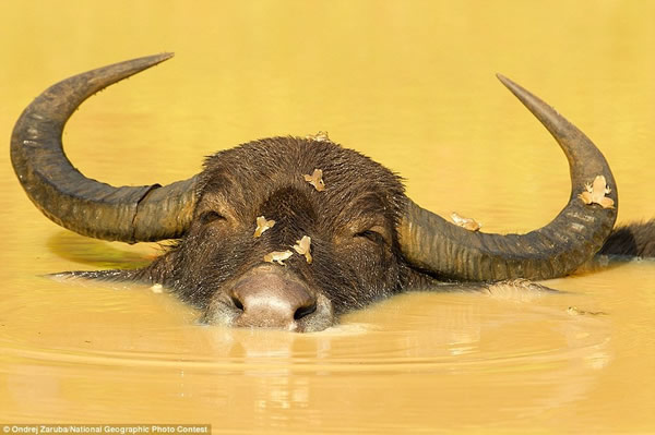 摄影师昂德里杰-扎鲁巴拍摄到的这头正在洗澡的母牛,它起来似乎很享受。