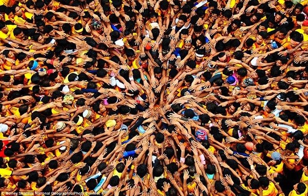 人们用叠罗汉的方式聚集在一起,形成一个人体金字塔,用来摘取并打破一个悬挂于空中的陶罐,成功者将能够获得相应奖金。本图摄影师为蒙尼-沙尔玛。