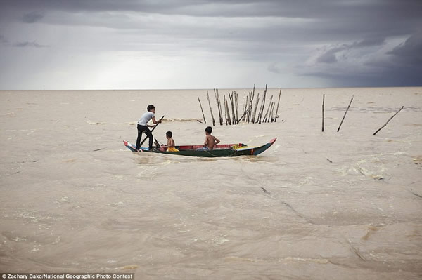 在一场风暴来临之前,摄影师扎查里-巴科发现几个男孩正在柬埔寨洞里萨湖上迎风搏浪。