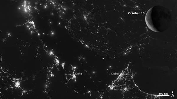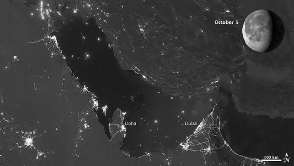 这几幅波斯湾地区的夜间照是Suomi NPP卫星分别于2012年9月30日、10月10日、10月5日和10月15号拍下的。每幅照片都包含一幅插图,它们分别显示了不同时刻的月相。