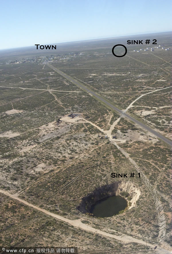 美国德克萨斯州,在该州Wink小镇附近,先后出现两处巨型地陷坑,其中最新出现的2号坑长达750英尺(约228米),宽600英尺(约183米),比1号坑足足大一倍,并且正以每天10英尺(约3米)的速度向外扩大。