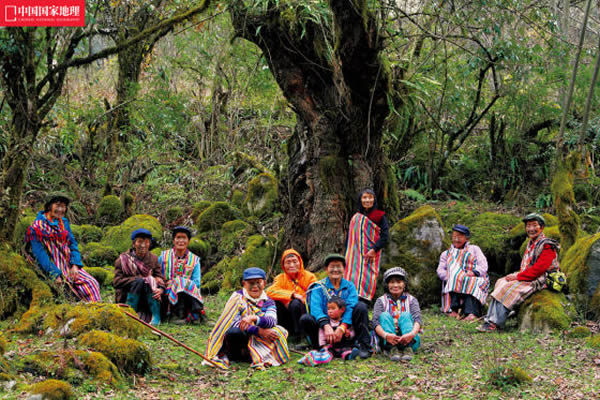 照片中的十位老人,都是脸雕青线的文面女。这是摄影师在雄当村拍摄的独龙江乡迪政当行政村所有身体尚佳、还能行走的文面女集体合影,她们是独龙族历史的活化石。独龙族是从原始社会直接进入社会主义社会的民族,以前不用公元纪年,所以这些文面女中的大多数并不清楚自己的文面时间。几十年的岁月在她们脸上留下了深深的印痕,只有那墨蓝色面纹不曾改变。如今的独龙族女人们已不愿意忍受文面时的锥心之痛了,随着时间的流逝,文面,这个独龙族千百年来传承的古老习俗,将随着最后一批文面女的去世而消逝。摄影/沈醒狮