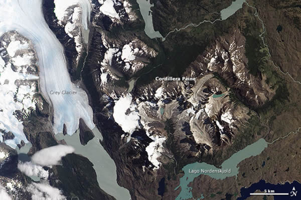 2013年1月21日,NASA的地球观测卫星1号(EO-1)拍下了这幅夏季的托雷斯・德尔・佩恩国家公园的照片。这幅照片只显示了公园的一部分,包括格雷冰川(Grey Glacier)和该公园的标志性山脉――科迪勒拉・德尔・佩恩山脉(Cordillera del Paine)。