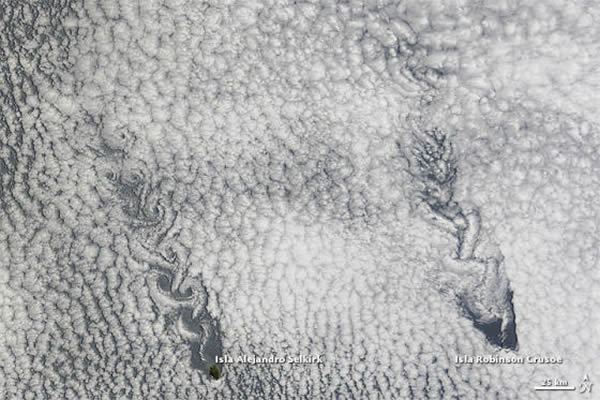 胡安・费尔南德斯群岛(Juan Fernandez Islands )距离智利海岸约800公里。其中最大的岛屿――亚历杭德罗塞尔扣克岛(Isla Alejandro)和鲁宾逊克鲁索岛(Isla Robinson Crusoe)坐落在一列东西走向的海岭旁边。这两座岛屿海拨都比较高。亚历杭德罗塞尔扣克岛面积约52平方公里,海拔1,650米。鲁滨逊克鲁索岛略小,总面积48平方公里,海拔922米。这两座岛屿的高度都足以对海洋上空的空气流动产生影响,从而导致岛屿下风侧(或背风侧)上面的大气层形成了冯卡门涡流。