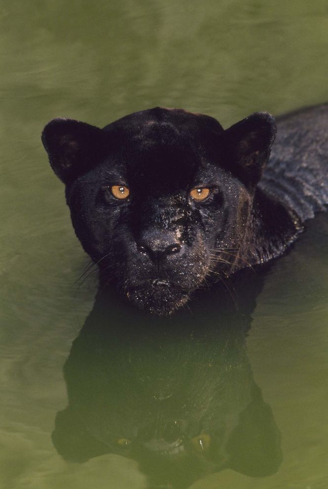 一只黑色的美洲豹(Panthera onca)蹲在巴西的一座水池内。黑色的美洲豹又称黑豹,但这其实是个「雨伞术语」,泛指任何拥有一身黑毛的大猫。摄影:Frans Lanting, National Geographic Creative