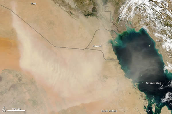 2013年3月24日,阿拉伯半岛遭遇沙尘天气,沙特阿拉伯部分地区、科威特和伊拉克均被沙尘暴袭击。此外,沙尘暴还横跨波斯湾,吹向伊朗。2013年1月11日,美国宇航局的Aqua卫星上的中分辨率成像光谱仪(MODIS)捕捉到这张自然色图像。