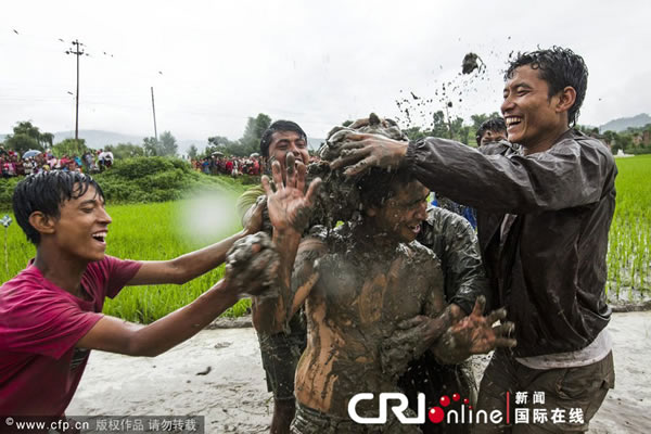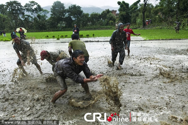 当地时间2013年6月29日,尼泊尔加德满都,农民庆祝“水稻日”到来。每年水稻种植季的开始时,尼泊尔当地农民都会用泼泥浆等传统方式庆祝开耕,祈盼好的收成。(图片来源:NARENDRA SHRESTH/CFP)