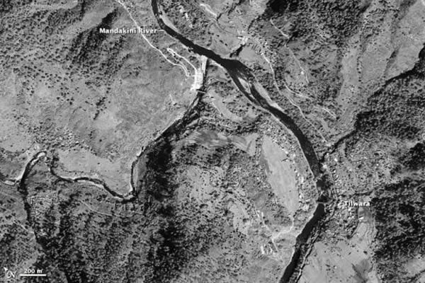 2013年6月26日,国际空间站(ISS)上的ISERV探路者(ISERV Pathfinder)相机拍下了上面的第一幅照片,显示了印度北阿坎德邦(Uttarakhand)提瓦拉村( Tilwara)附近的曼达继河(Mandakini River)的景象。由于天气和拍摄角度等原因,照片不太清晰。虽然洪水已过,但曼达继河看起来还有些膨胀,河中垩白灰色和黄褐色的沉积物使河流本身与河堤难以区分。第二幅照片是美国DigitalGlobe公司的 WorldView-2卫星于2009年3月2日拍摄的,显示的是同一地区的景象,可以作为对照。(新浪科技 思北)