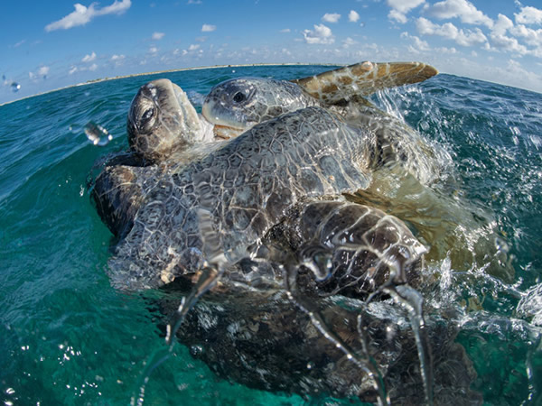 欧罗帕岛绿P龟求爱时会互相碰撞及啃咬(上),接着是可能持续数小时的交配(下),交配时,公龟以鳍肢与尾巴攀附在母龟的背甲上。在绿P龟的世界里杂交盛行,被荷尔蒙支配的公龟会试图把对手从母龟身上驱赶下来。