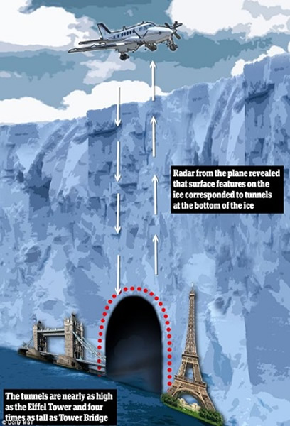 (神秘的地球报道)据中新网:一队英国科学家通过雷达探测发现,南极冰层下存在一个巨型隧道,这一隧道的高度堪比法国的埃菲尔铁塔。