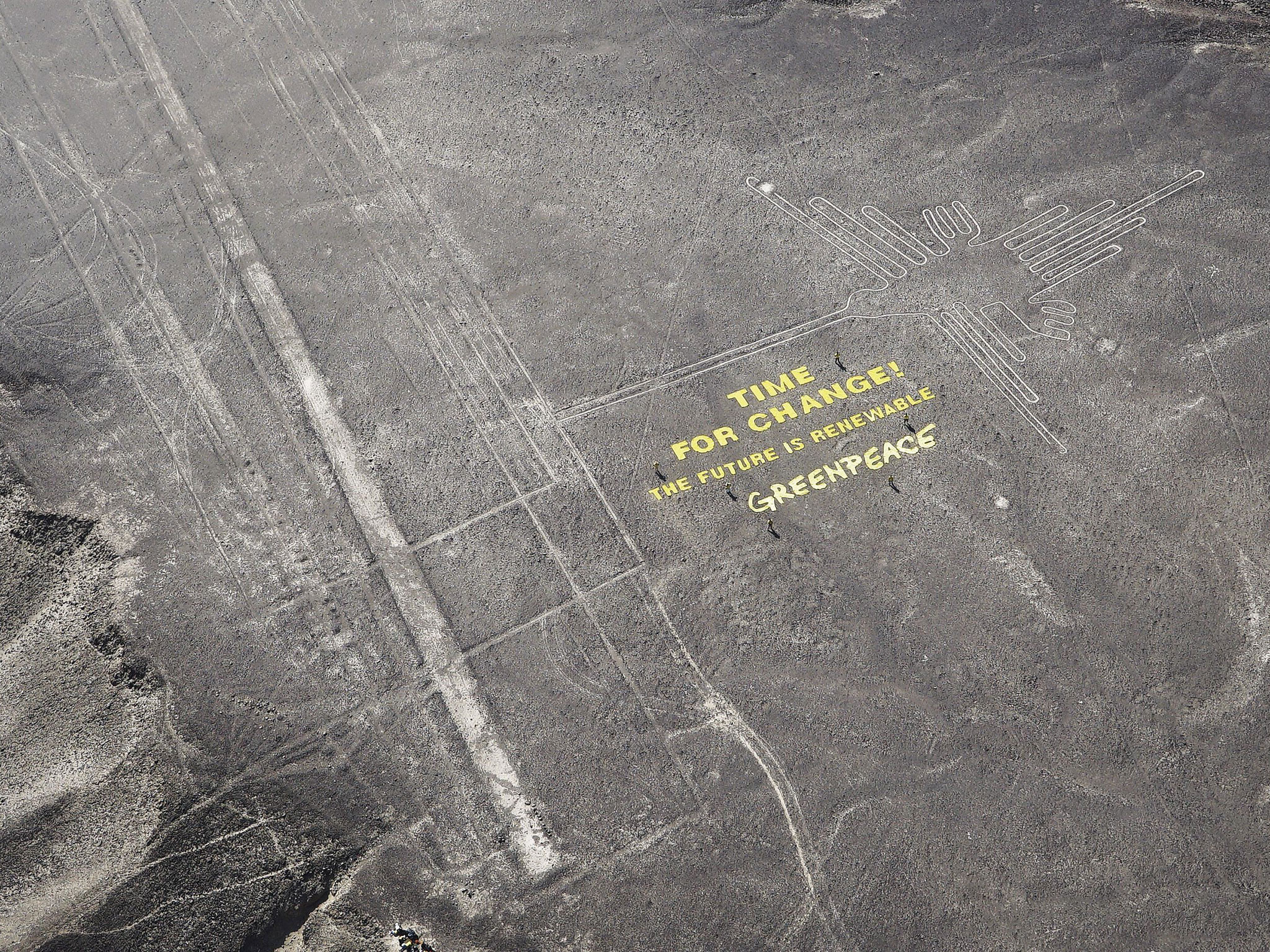 联合国气候会议正在秘鲁举行,就国际气候议题讨论与谈判,绿色和平组织为表达其诉求,20名成员闯入「纳斯卡线」,并在地面铺排标语,「改变的时刻到了!再生能源才是未来。」秘鲁文化部部长就说,这等于赏了秘鲁人心中的神圣事物一巴掌,秘鲁当局打算提出刑事诉讼,绿色和平组织成员有可能面临最高6年的徒刑。