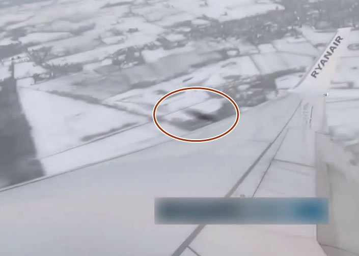 一个黑影(红圈示)迅速掠过,差点撞上客机机翼。