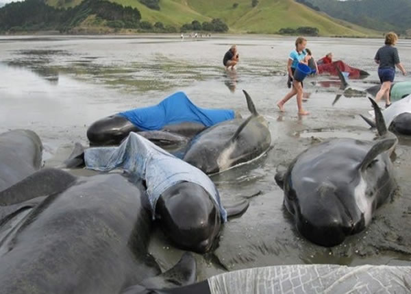 在夏天,新西兰经常发生领航鲸大规模搁浅的事件,但科学家至今仍不清楚具体原因。
