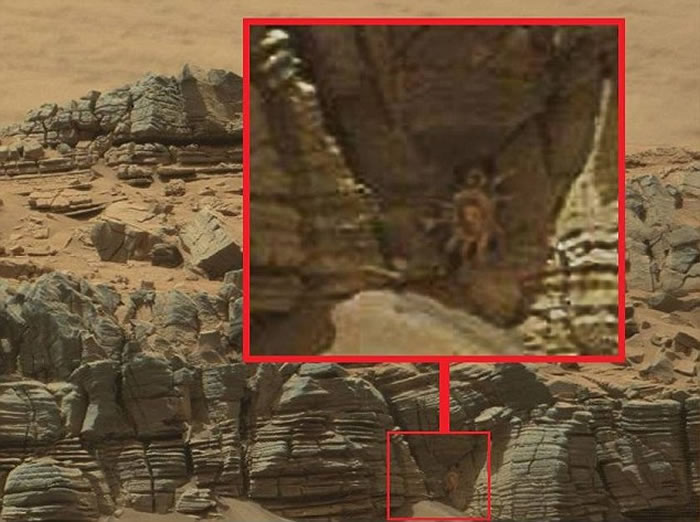 经常有人声称在火星表面发现各种“智慧生物痕迹”。UFO每日观察网站近来还刊发了在火星上发现的幽灵女子、军事碉堡以及奥巴马的头等照片。10月初,还有人宣称在火星照片中发现“抱脸虫螃蟹”。自从这张照片被传到Facebook上后,许多人称它像1979年电影《异形》中的抱脸虫怪物。