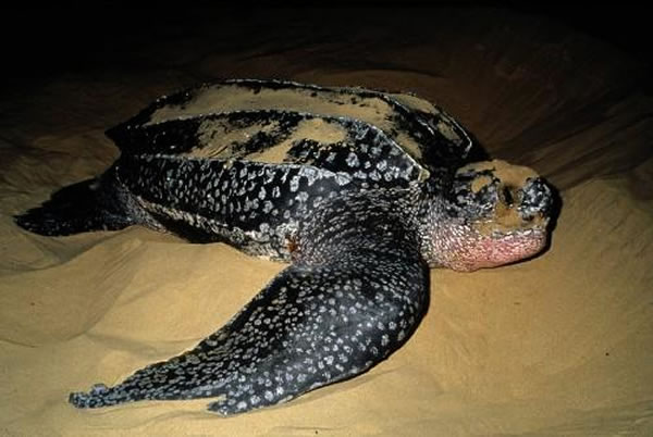 美国南加州约基南小岛保护区沙滩发现一只搁浅的巨型棱皮龟