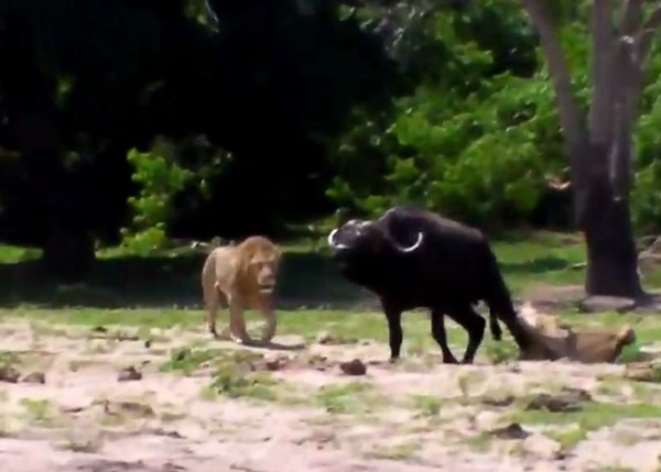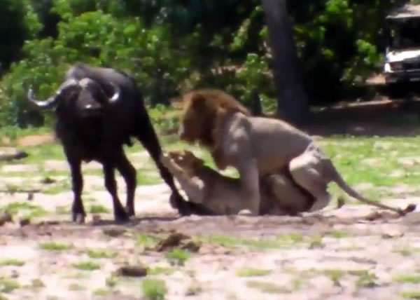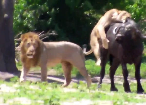 由于水牛体型庞大,母狮独力难以应付,纵使多番跳上水牛背,又或是在地上咬住水牛的后腿,都无法制服水牛。此时一直只在旁观看的雄狮,竟趁母狮伏在地上咬水牛后腿时,骑上母狮背上做出“霸王硬上弓”的动作。