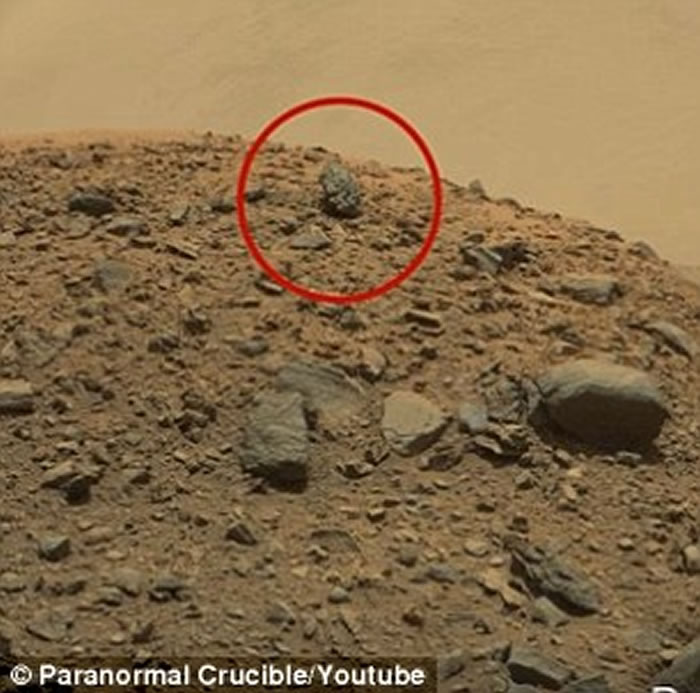 在美国宇航局好奇号火星车传回地球的地球图像中,发现了这个奇怪的物体。好奇号火星车自从2012年以来就一直在火星周围旋转。一个自称外星人猎人Paranormal Crucible表示这个头骨“显然是外星人的”,似乎类似于传说中被称为大脚野人的遗骸。在视频下方,他们表示,被火星车发现的奇怪石器,看起来像一个大头骨,显然是外星人的,它有可能是一个大脚野人或奇异火星生物的遗体吗?