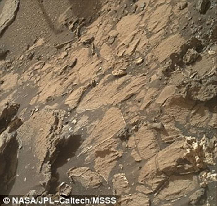 “好奇号”火星车放大相机拍摄的原始图像,岩石残骸散布在火星表面