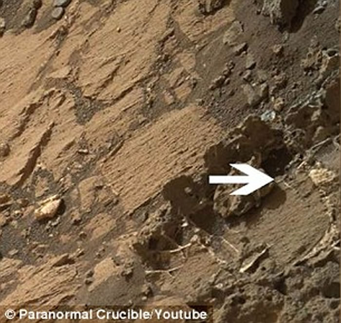 局部放大图像,外星人狂热爱好者表示,这个神秘结构是火星表面上某种生物的骨骼残骸。