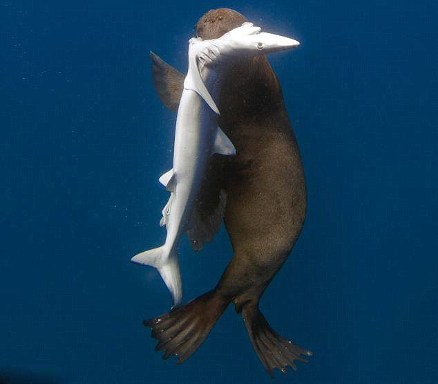 (神秘的地球报道)据环球网(实习编译:周英文):海豹给人的第一印象就是性格温顺只吃小鱼的呆萌动物,但是它们发起飙来也是很凶残的!据英国《每日邮报》3月26日,近日,海洋摄影师克里斯・法洛斯(Chris Fallows)在南非海岸发现一头海豹对一条体型中等的蓝鲨发起袭击,并吃掉了蓝鲨的内脏,行为反常。