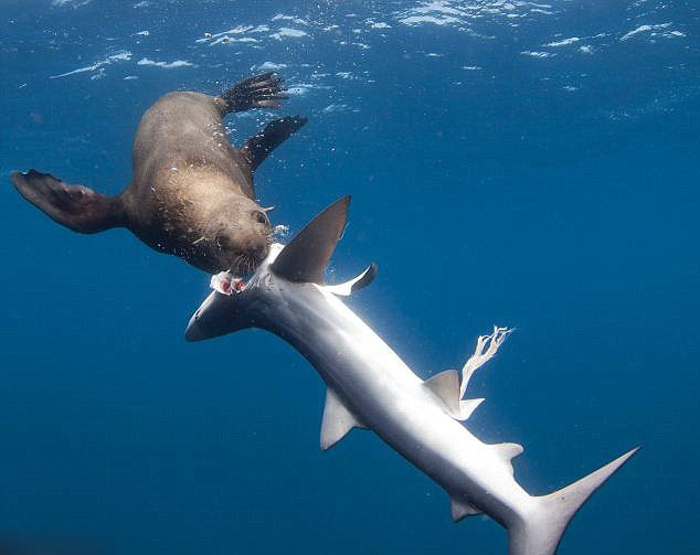 海洋摄影师Chris Fallows在南非海岸拍摄到一头海豹对蓝鲨发起袭击并吃掉其内脏