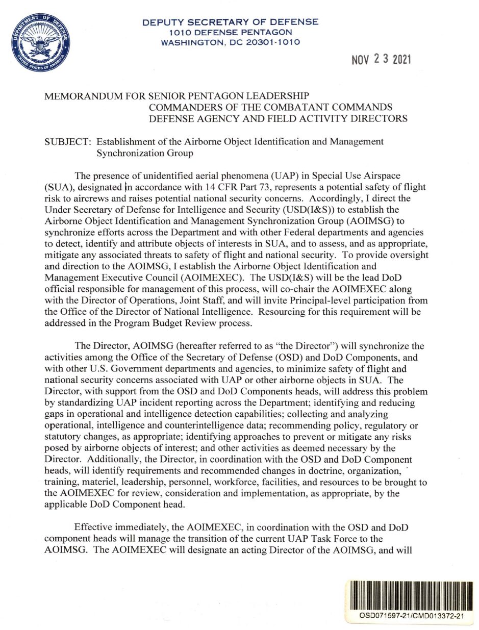 美国国防部宣布将成立新的UFO跟踪分队AOIMSG