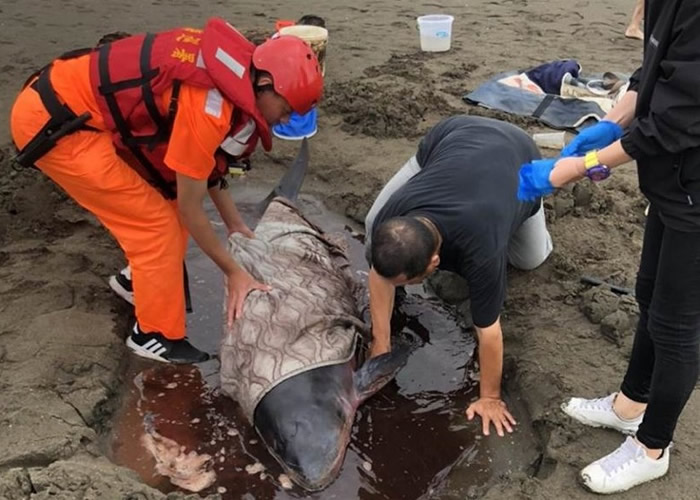 台湾桃园市观音海水浴场附近沙滩上发现搁浅小抹香鲸