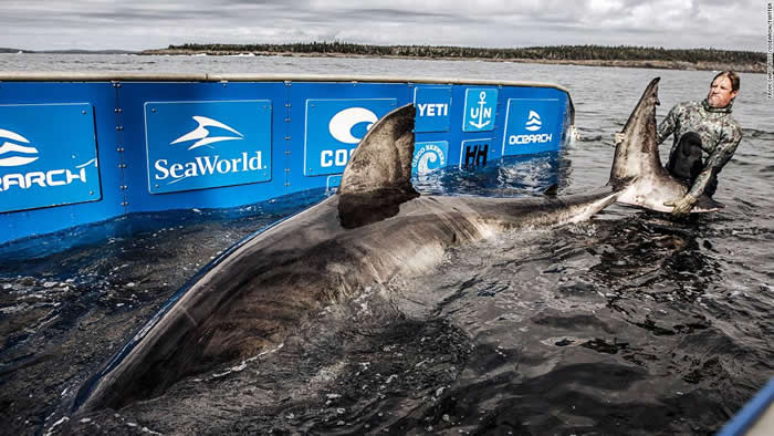 OCEARCH组织的团队成员克里斯・费舍尔说:“这是一个非常古老的生物,真正的海洋女王。它有疤痕,愈合的伤口,这些伤讲述了它以前生命中的既深刻又丰富的故事。”根据研究者的资料显示,这条白鲨50岁。科学家们给它做了标记,进行了采样并把它放回了大海。