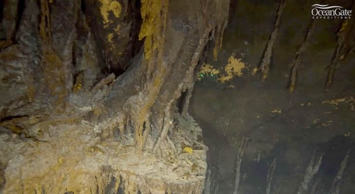 这段视频由美国海底勘探公司海洋之门(OceanGate Expeditions)发布,画面显示了船首、左舷锚、巨大的锚链等等,船体锈迹斑斑。海洋之门宣布,从现在开始,将使用高清镜头来监测船只衰变的情况。