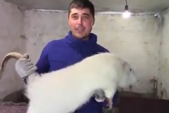 从影片中可以看到,一名男子从像是工厂的角落拎起一只非常巨大的老鼠,虽然它的外观跟常见的实验室白老鼠没有太大的差异,不过体型比小型犬还大,且有着跟泥鳅一样粗的尾巴,脚上的爪子还像鸭子的蹼一样大大地张开。