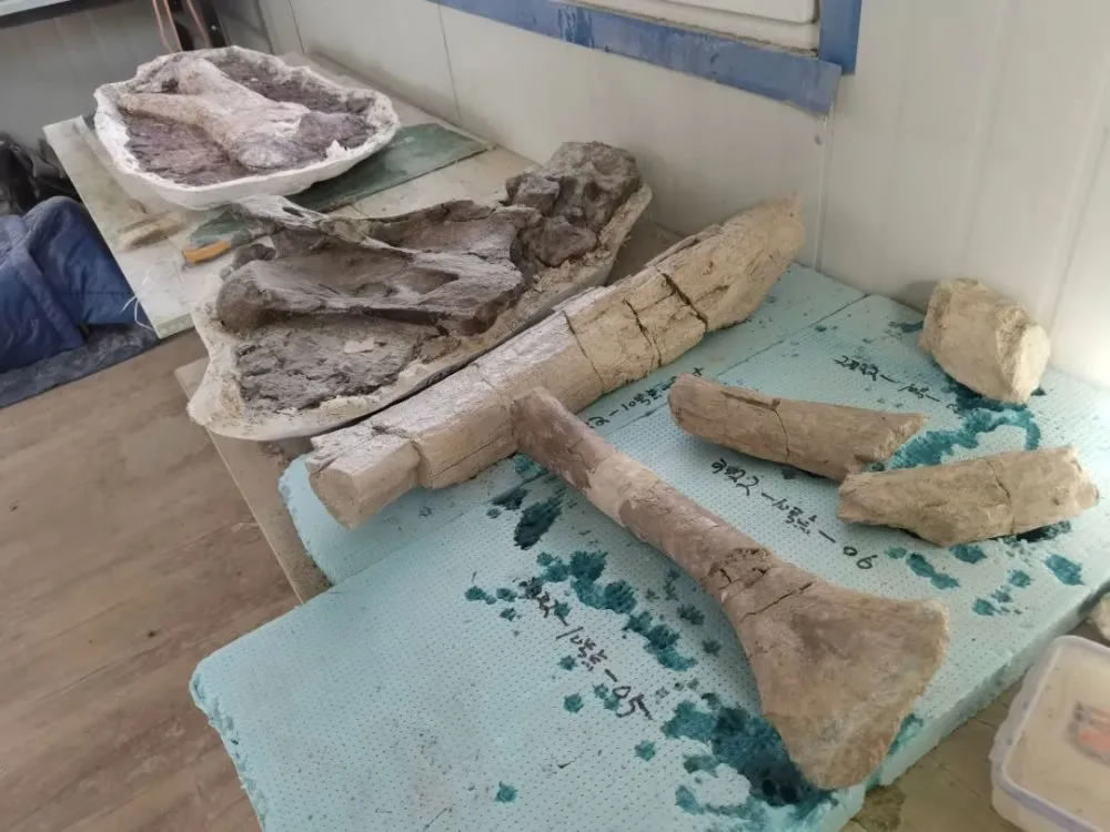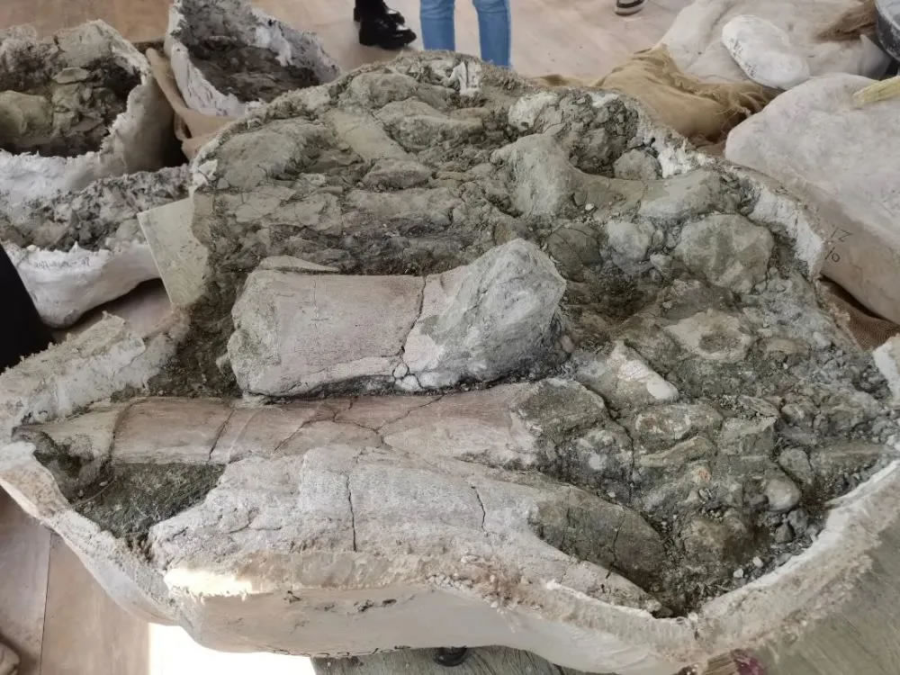 记者在现场看到,六七个包裹着化石及周边围岩的定型石膏包摆放在台面上,每个石膏包内都布满大小不一的骨骼化石,其中一些形态完整的肢骨较为清晰。