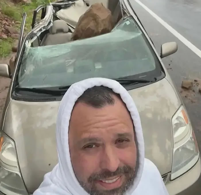 莫理丘表示,当时他手机突然响起,所以他下车去接电话,结果没多久就听到身后传来一声巨响,回头发现巨石砸在他刚刚所在的驾驶座上,整辆车瞬间被压扁。