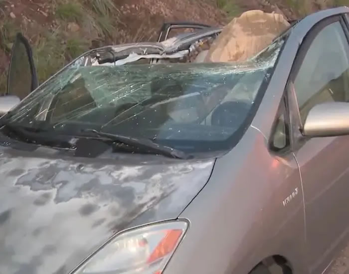 (神秘的地球uux.cn)据ETtoday(记者 李振慧):美国加州男子莫理丘(Mauricio Henao)在马里布(Malibu)开车时,突然从山上滚落一颗大石,刚好砸中他的车,幸好事发时他为了接女友电话下车,结果因此逃过一劫,回过头发现巨石正好砸在驾驶座上。